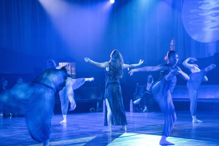 Their stellar singing is accompanied by live musicians Dave Eggar on cello and keyboard and Chuck Palmer on percussion and set to pre-recorded electronic synth soundtracks (produced by Fanai and Kinkel, with sound and mixing by Linds Cadwell) that contribute aurally to the preternatural tone. And the entire fully committed ensemble of Guides – Morgan Andrews, Alyssa Rose Bulin, Kenley Hardwick, Kaori Hiwasa, Jamal Shuriah, and Jordann Stoute – embraces the purpose and transcendent actions of the spiritual figures, in their stunning execution of choreography (by Natalie Lomonte) that combines modern dance, expressionist movement, and acrobatics, with solemn and joyful ritual.