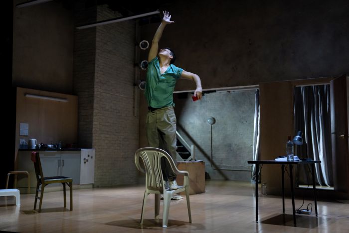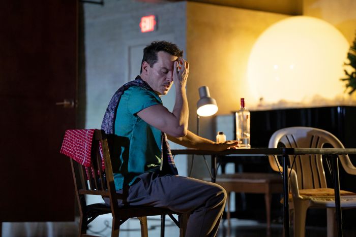 The setting here is no longer a rural estate in the Russian countryside but a potato farm (presumably in Ireland, based on Scott’s heritage and accent, and the nation’s traditional crop) and the rundown interior of the house in Vize’s scenic design contains minimal modest furnishings of the late 20th century, including a white plastic garden chair, a vintage slide projector (video design by Jack Phelan), a cassette tape player, a handheld device used to emit sound effects (sound by Dan Balfour), a recycling bin for the omnipresent vodka bottle when empty, and an upright piano played by the unseen ghost of Anna.