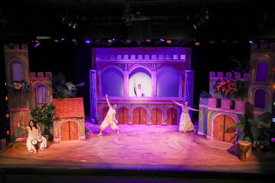 Four ensemble players scurry along the castle-looking set — great design by Jade Rivas — and perform roles of enchanted maidens, brave princes, ferocious animals, and everything in between. The stories show the importance of respect for one’s heritage and comradery to help each other along the way. One ingenious fellow encounters large wild animals on his journey that turn into stuffed toys that he can pack away and retrieve as needed. In another, the colors of a rainbow emerge as scarves from inside a young girl in her loving tribute to the earth and loved ones. And then, of course, there’s lots of imagination and even bits of magic throughout as the tales reach back 500 years to Pre-Columbian times when the performers relayed stories of artistry and fortitude. The cast members even carry a hand-sized cut-out replica of a large sail vessel and blue waves of water across the stage to show the voyage from Spain to the Americas. The lithe performers share stories through joyful songs and poetry and end with rousing drumbeats, bringing everyone on their feet to join in.