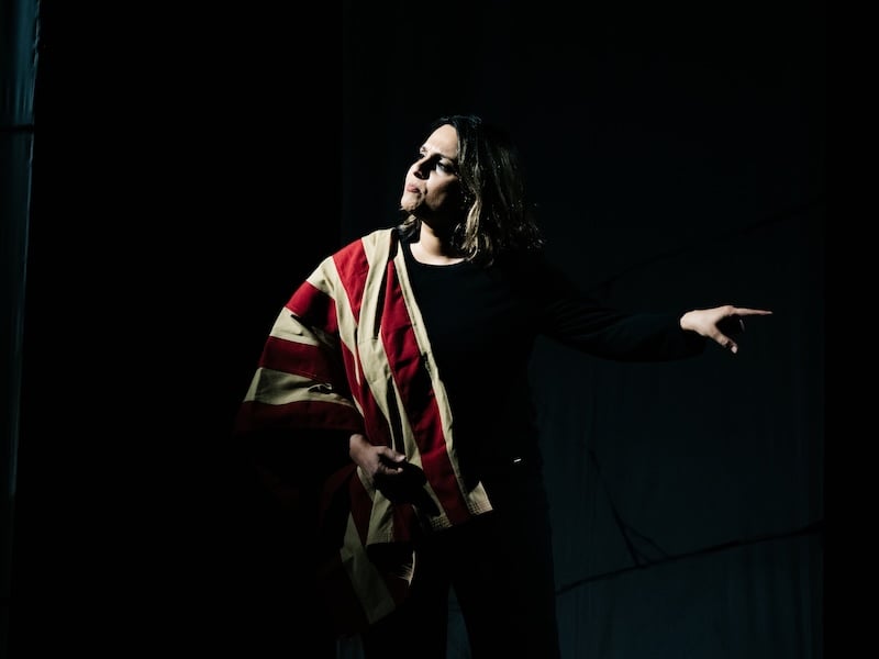 Yury Urnov’s directing skillfully leans into the one-person drama. Multiple screens display video, and black-and-white images work with a minimum of sound and lighting shifts on a stage bearing a single key prop — the American flag — to signal character and mood shifts. The intimate setting of the Keegan Theatre is perfect for this one-person show.