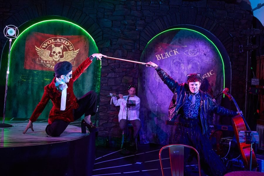 Fran Tapia as Woland and Jeremy Allen Crawford as Behemoth in ‘Professor Woland’s Black Magic Rock Show.’ Photo by DJ Corey Photography.