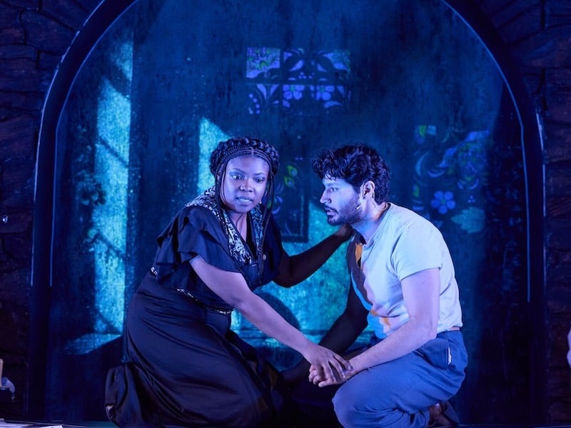 Enter Margarita (an outstanding Jordyn Taylor), who is in love with both The Master and his novel. She believes in him, and their connection is deep, as when they sing in a duet, “The hope of happiness is making my head spin.” Margarita is determined to rescue The Master’s “enemy of the state” manuscript, and in one charming scene, they play-act a bit of the book, The Master as Pontius Pilate and Margarita as Yeshua (aka Jesus). Their love is arrestingly tested by external threats and internal terrors, and through it all, an extraordinary theme emerges, first voiced as a precept and prophecy by Margarita as Yeshua: “All authority is a form of violence over people and … the time will come when there will be no rule. Man will pass into the kingdom of truth and justice where there will be no more need for authority.”