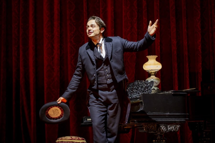 The show starts off as a farcical comedy with a grand piano sitting prominently near center stage. Once the actor, as Booth, enters and starts playing complicated rhythms and passages, it appears that he is a gifted pianist portraying Booth’s unknown talents. But then, as the sophisticated arpeggios pound upward into higher registers that only an impresario could achieve, Booth rises to his feet with a flourish while the piano keeps playing. That curious opening reflects the story’s ambitious premise of a shallow showman basking in adoration and praise of his own making.