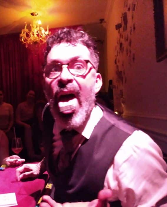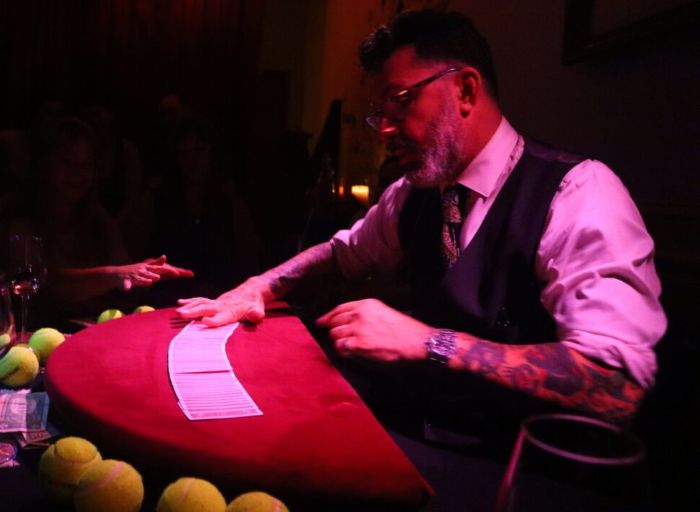 For the opening set, Greg (everyone there is on a first-name basis) asserts that nothing in the art of prestidigitation is real and teases that he’ll show us how the tricks work, employing the classic props of a kerchief, egg, deck of cards, cups and balls, and a magic wand. But instead of revealing the secrets, he confounds us again and again with his mystifying legerdemain. All of the participating members of the audience, who had direct contact with him and the objects he used, were completely bewildered, and though I was seated closest to him, with a view under the table where he was performing, I never once saw how he did what he did – even when he executed one of his feats in slow motion. To avoid any spoilers, I won’t get into the specifics of the illusions you’ll see, so you, too, can be surprised and baffled by his stunning skills.
