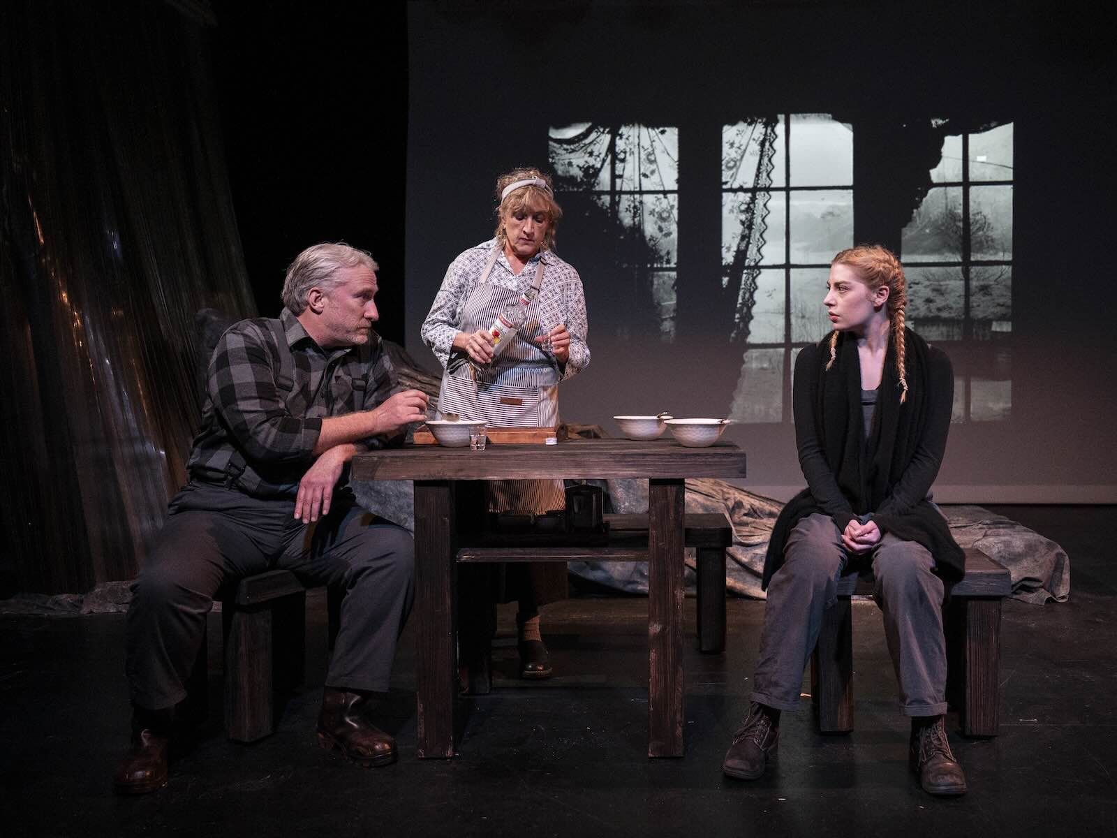 Death looms large in young Hanna Hauser’s world — as stark and imposing as the mountains that surround her Alpine village — while life is as harsh as the howling winds that blow in every fall and portend the arrival of snow. Hanna’s brother, Melk, died suddenly and mysteriously two years earlier, a death that her father, Jakob, and the village pastor, Father Hoffmann, describe as “dying of melancholy.” As the second anniversary of Melk’s death approaches, the unanswered questions surrounding it echo through Hanna’s family and their isolated dairy farming community like the sounds of yodeling that punctuate the sound design of ExPats Theatre’s new production of Cold Country by Swiss playwright Reto Finger, now playing at Atlas Performing Arts Center.