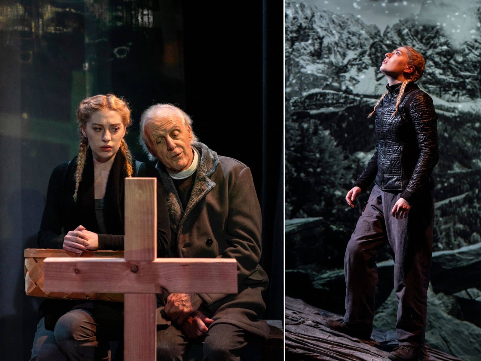 Translated and directed by Rosnizeck, ExPats’ production of Cold Country opens with voiced-over narration of a mythical tale weaving together elements of several Alpine legends, backed by swelling strings and ethereal yodeling (sound design by Rosnizeck, Laura Schlachtmeyer, David Bryan Jackson, and Andrew Bellware) as stunning black-and-white footage of snowy peaks appears on a screen at the back of the stage (Tennessee Dixon, projections designer). Finger’s opening fable features a dairy farmer named Macolvi haunted by the death of his daughter and demanding a reckoning from the divine, and is retold by Hanna and referenced by her parents throughout the play, serving as a frame story for the Hausers’ own.
