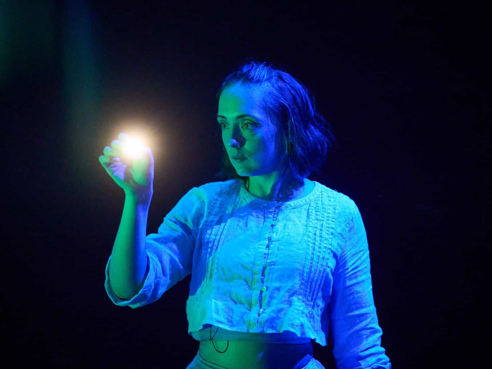 The lighting and sound design are major players here. And it was a job well done by John McAfee and Jason Charney. The lights ripple and pulse like moonlight through trees, while the soundscape — a mix of live music, whispers, and ambient tones — fills the room like another presence. You don’t just see this show; you feel it vibrating through the air. The technical artistry has been elevated — each element layered so carefully that the boundaries between performance and environment seem to disappear.