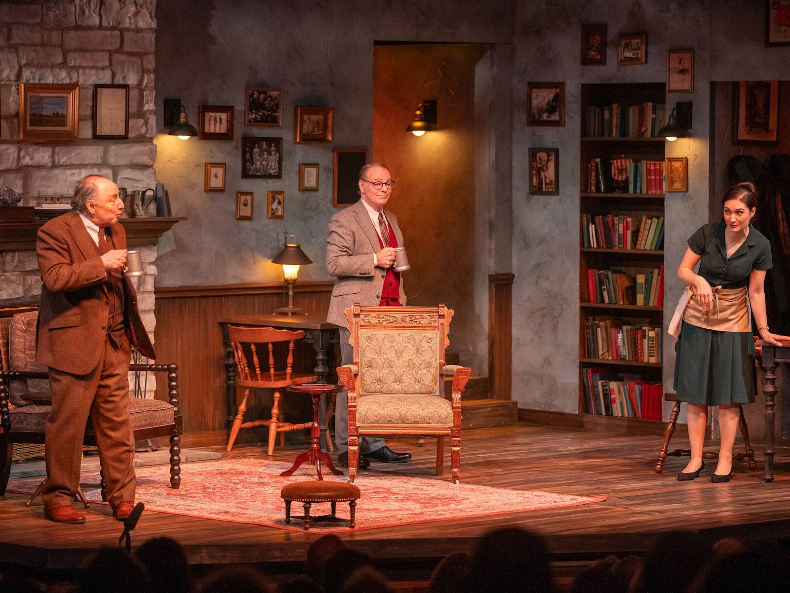 Set designer Tom Buderwitz turns the stage into a cozy English pub with a fireplace, antique books and furniture, eclectic artwork and knickknacks, including a picture of Alice in Wonderland’s White Rabbit on the wall — a nod to the “Rabbit Room” in the real-life Eagle and Child, where Lewis, Tolkien, and their literary circle, the Inklings, gathered in the 1930s and ’40s. Warm lighting (lighting design by Max Doolittle) and soft piano music (sound design by Justin Schmitz) add to the ambiance.