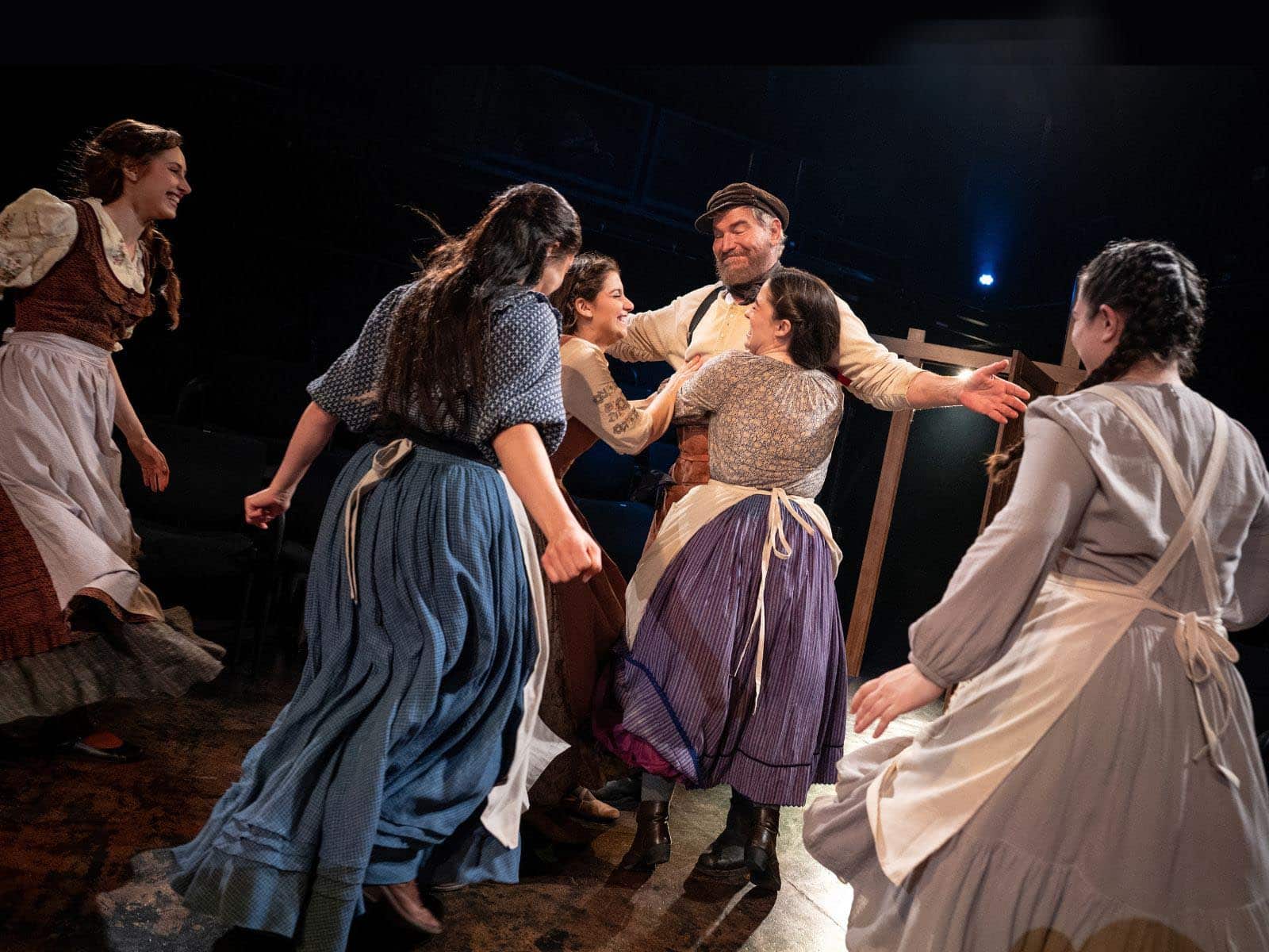 Start with Misha Kachman’s flexible and evocative set. It begins as a large, square table, taking up most of the playing space in the theater’s in-the-round configuration, the solid gathering place for the community and its traditions, around which the cast sings the opening number. As the show goes on, the rectangular pieces that comprise the table are reconfigured for use in various scenes and, one by one, are taken from the stage, until by the time the villagers leave Anatevka for the last time, the stage, save for one broken piece of a table, is bare. The set, as it changes, wordlessly tells Fiddler’s story of change and loss.