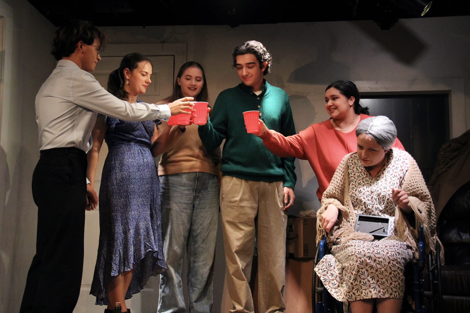 As soon as the play began, I forgot I was watching college students. The makeup and costume teams masterfully transformed Lyle into an elderly woman and Viana and Levinger into middle-aged parents. Under Fynewever’s direction, the actors fully embodied their characters. Levinger and Rivero perfectly captured the father/son-in-law relationship with Rivero’s attempt to find common ground and Levinger playing. Viana’s mannerisms and tone of voice perfectly captured those of a mother who feels like she is losing her sway over her daughters. Toloszko and Golden had very good chemistry as sisters — their subtle looks at each other when Deirdre made an awkward comment and their laughter as they shared inside jokes were very realistic. Lyle’s performance was particularly striking. Despite being a college junior, her portrayal of Momo’s dementia felt extremely real. I could feel her wariness and confusion throughout the play, and her breakdown was especially chilling.