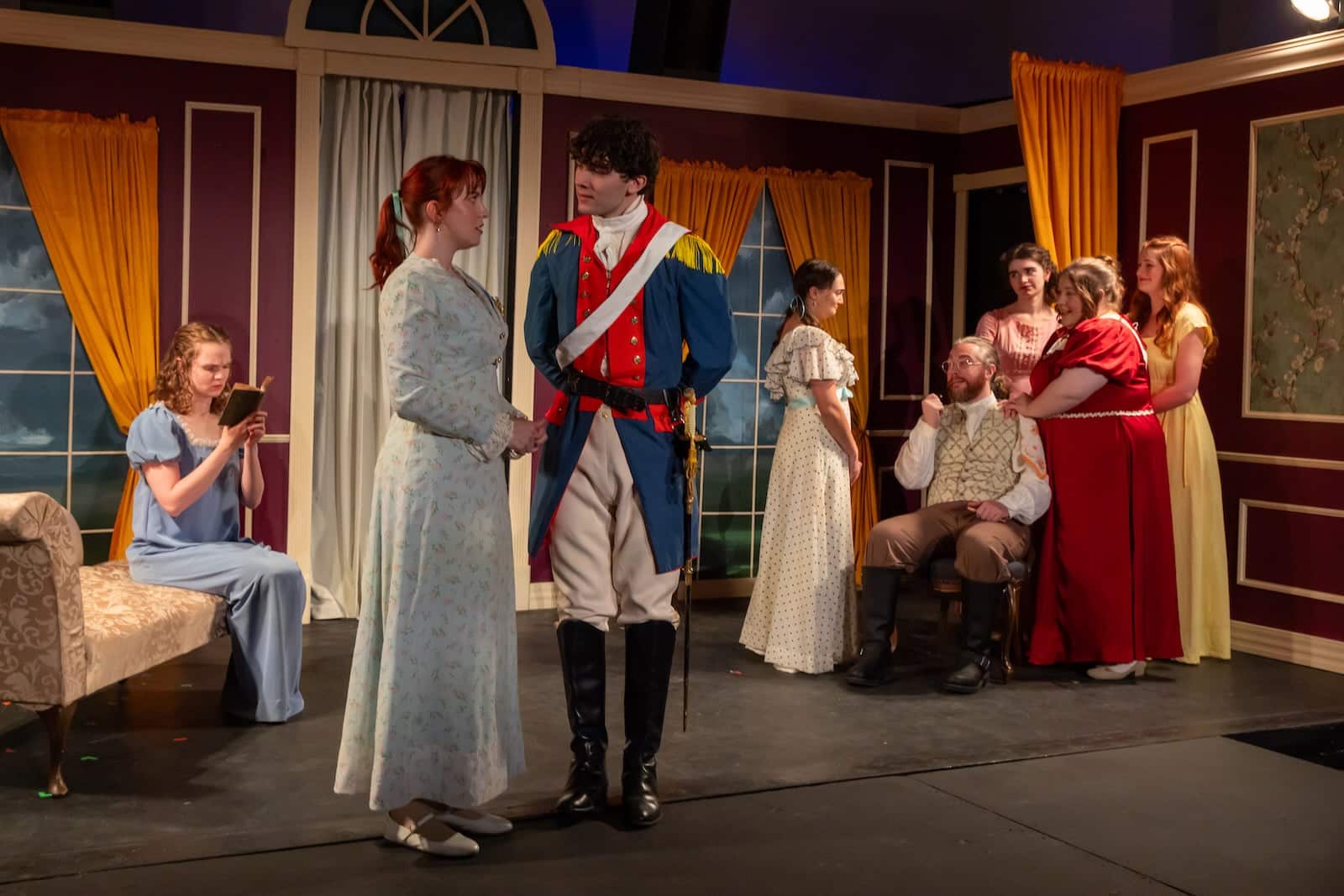 As the Bennet sisters, Caleigh Riordan Davis (Elizabeth), Molly Marsh (Jane), Emma Magner (Kitty), Leah Senseney (Lydia), and Peri Walker (Mary) each gave effervescent performances. Their camaraderie and enthusiasm shone through in every scene, and they expressed every emotion with heart, from excitement to dismay. Davis was also refined and stately as Elizabeth, personifying this legendary character through sophisticated speech and refined mannerisms. Walker displayed a gorgeous soprano voice as a featured soloist at the ball, showcasing extraordinary vocal talent. In an outstanding performance as Mrs. Bennet, Katie Rey Bogdan colorfully conveyed her frustration with her daughters’ lack of marriage prospects. Her animated facial expressions and slapstick mannerisms were tremendously entertaining, and her brash delivery elicited hearty laughter.