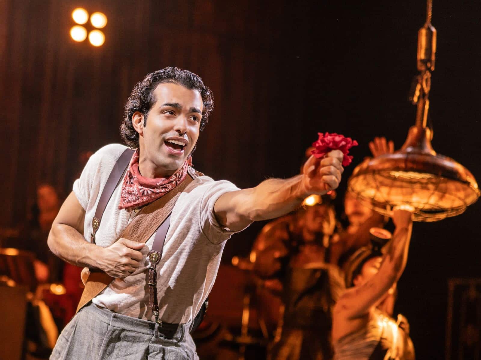For instance, during two climatically emotional moments — first from Eurydice (Colton) during “Flowers” and then Orpheus (Contreras) during “If It’s True” — each performer falls to their knees center stage, eyes welling with tears, as all 12 spotlights fall directly on their frail forms. Bright lights, sharp in contrast and shape, shine down like 12 daggers piercing their broken hearts. Another example is the soft lanterns used to highlight Eurydice’s shadow and silhouette as we follow Orpheus out of Hadestown during “Doubt Comes In.”