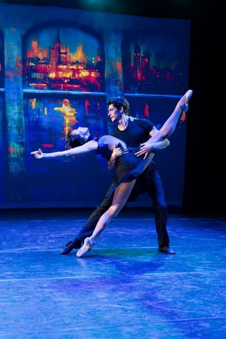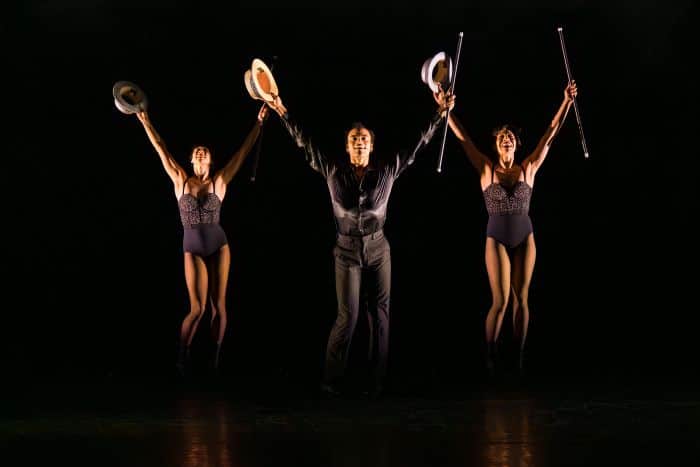 In addition to the well-curated variety of shows is the wide array of dance styles that characterizes them, including everything from the Lindy Hop, swing, tap, jazz, and ballet, to modern dance, the shimmy, and rocking-and-rolling. Among the highlights are “Cool” from West Side Story, with Minard and members of the company embodying the rival gangs of the Sharks and Jets, and enacting their rumble with abstract moves and sounds; the outstanding Burks and LeProtto energetically singing and tapping to “Moses Supposes” from Singin’ in the Rain; the balletic “Pas de Deux” from An American in Paris, beautifully danced by the lithe and graceful Pazcoguin and Cowperthwaite; and the dark “Manson Trio” from Pippin, displaying the spot-on precision of Stanley, Hines, and Pazcoguin as they deliver Fosse’s groundbreaking elements of angularity, isolation, hip rolls, and turned-in knees, employ his signature hats and canes, and leave us with the famous “Ta Da” moment at the end.