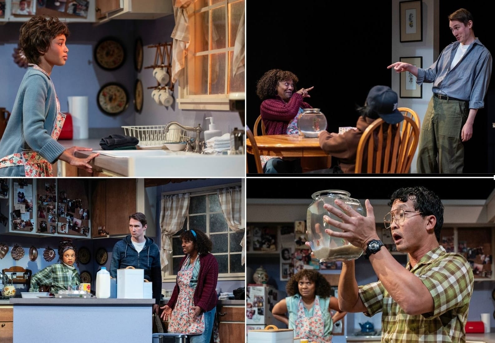 The set by Jonathan Dahm Robertson is a wonder: a charming, working kitchen styled as though for a homey cooking show, with copper molds on the wall and checkered curtains on the window. It stays the same throughout, with the same array of family photos displayed on cupboards and fridge. What Ernestine wears in Lynly Saunders’ subtly everyday costume design, a 17-year-old’s bib overalls and sneaks, also never changes — a lovely image of what can last of one’s youth.