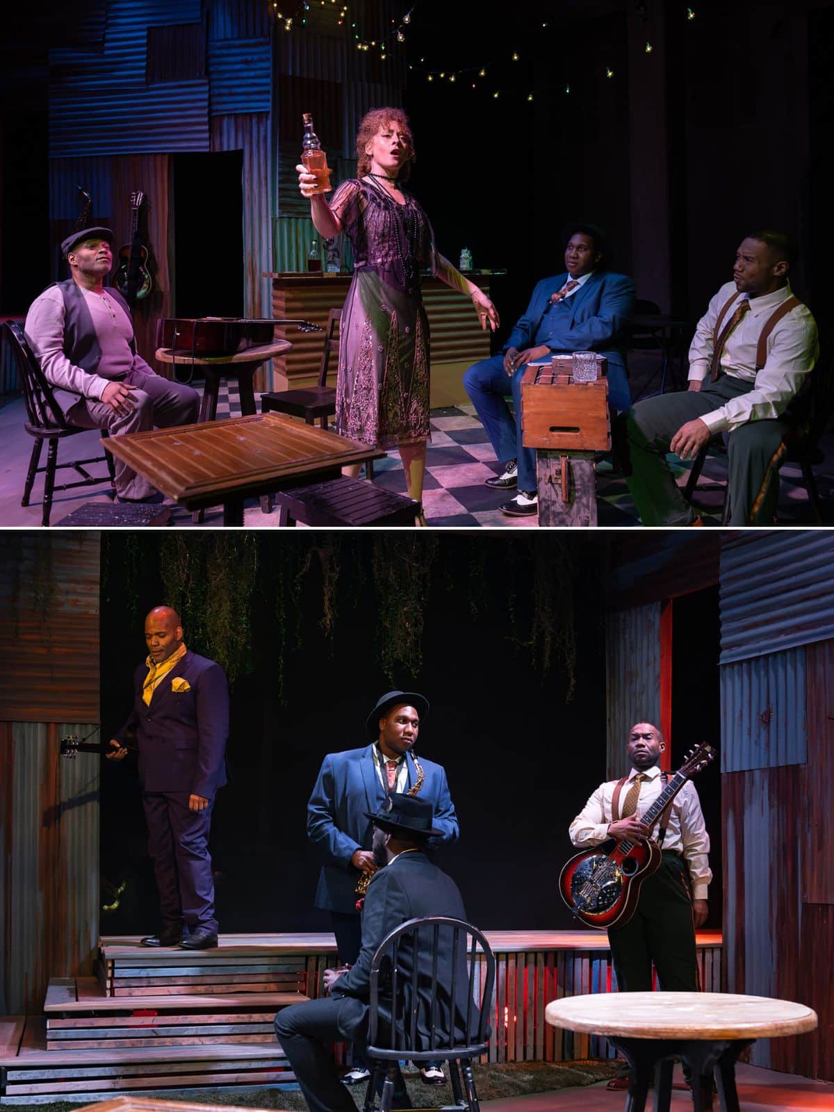 For most of its length, the staging of The Delta King’s Blues suspends us in a satisfying and mystifying dream. The very last moment of the show, though, confused me. The barkeep, played by Melissa Wimbish, sings “Last call!” in an ordinary but ominous echo of what we’ve heard her sing before. Then she and the musicians begin to gather casually on the bar’s stage. The musicians get themselves into position to begin another song when the music stops and the lights abruptly go out. The audience is suddenly pulled out of its reverie and left to wonder what happened. This staging leaves the audience hanging — perhaps on the precipice that precedes the monumental fame Johnson will acquire well after his death. But it is not certain. After giving in to the dreamy atmosphere that had come before, I wanted more.
