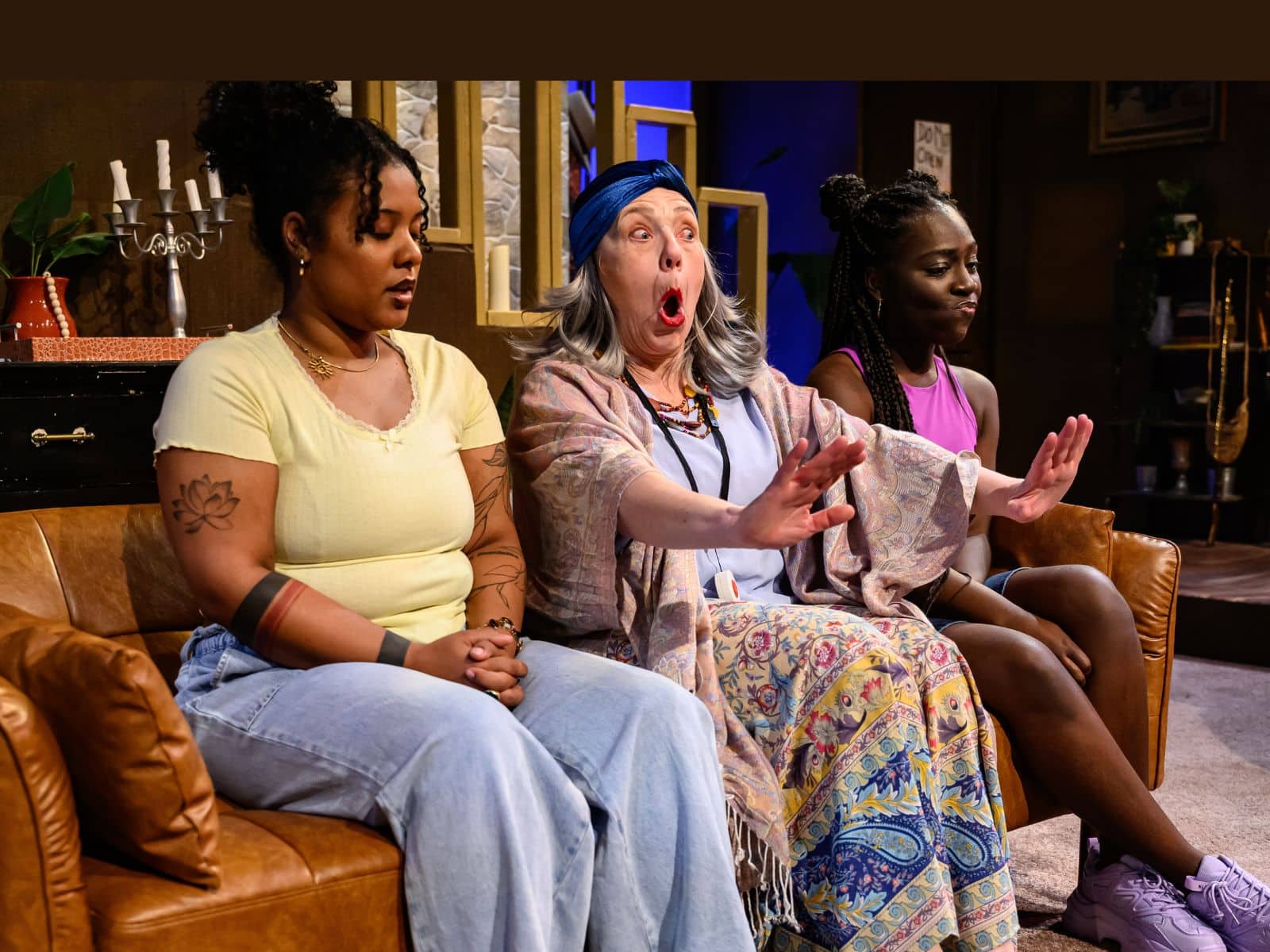 Jasmine Proctor as RiRi, Mary Myers as Jillian, and Amber Patrice Coleman as Dee Dee in ‘↓D←R←O←W←N←E←R [Renword].’ Photo by Heather Regan Photography.