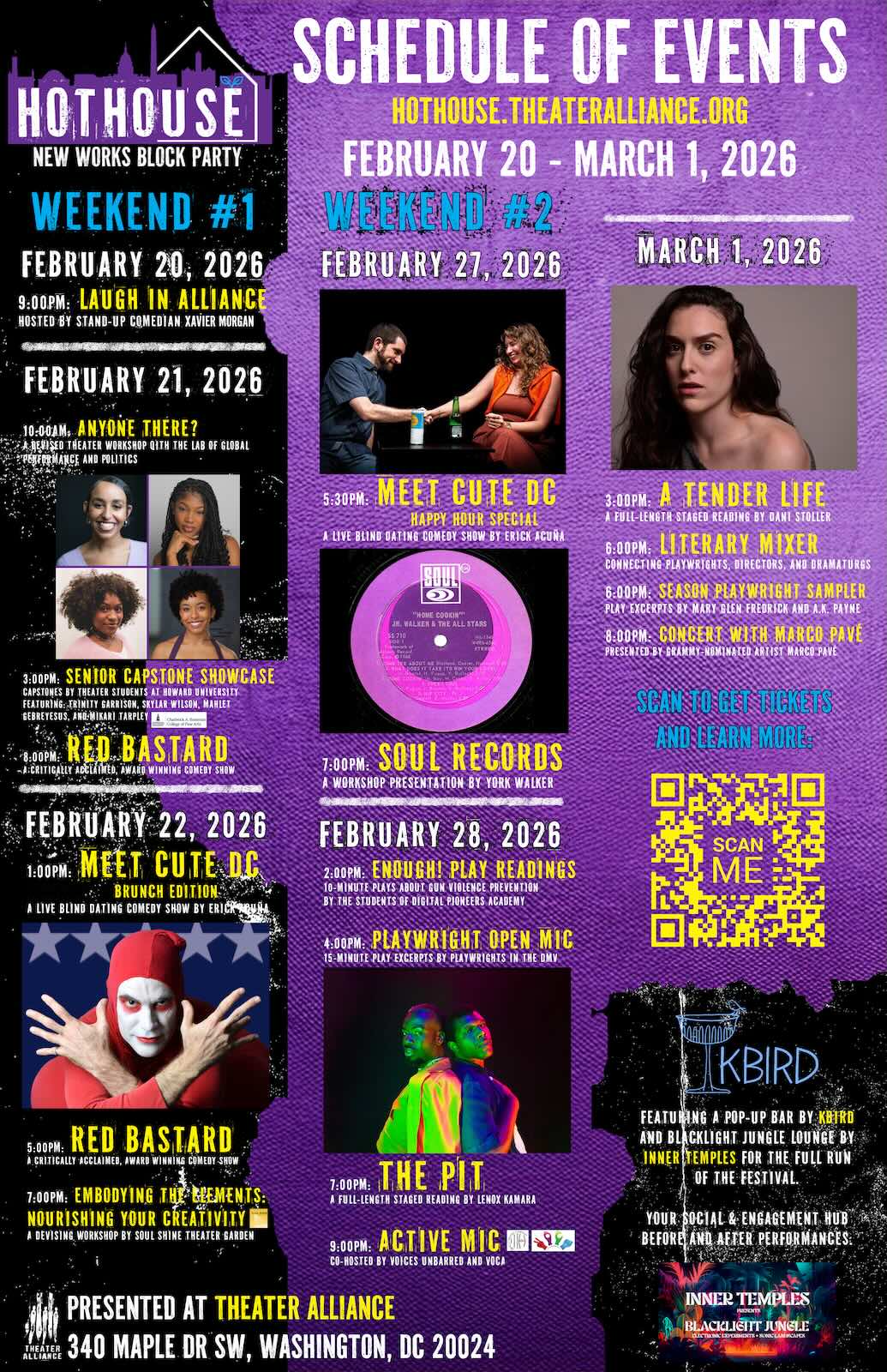 The 2026 Hothouse New Play Block Party runs February 20-22 and February 27-March 1, 2026, at Theater Alliance, 340 Maple Dr SW, Washington, DC 20024. Tickets and the full festival schedule are live now. Attend a single event or purchase a package to see multiple shows at a discounted price. Learn more about Hothouse online at hothouse.theateralliance.org.