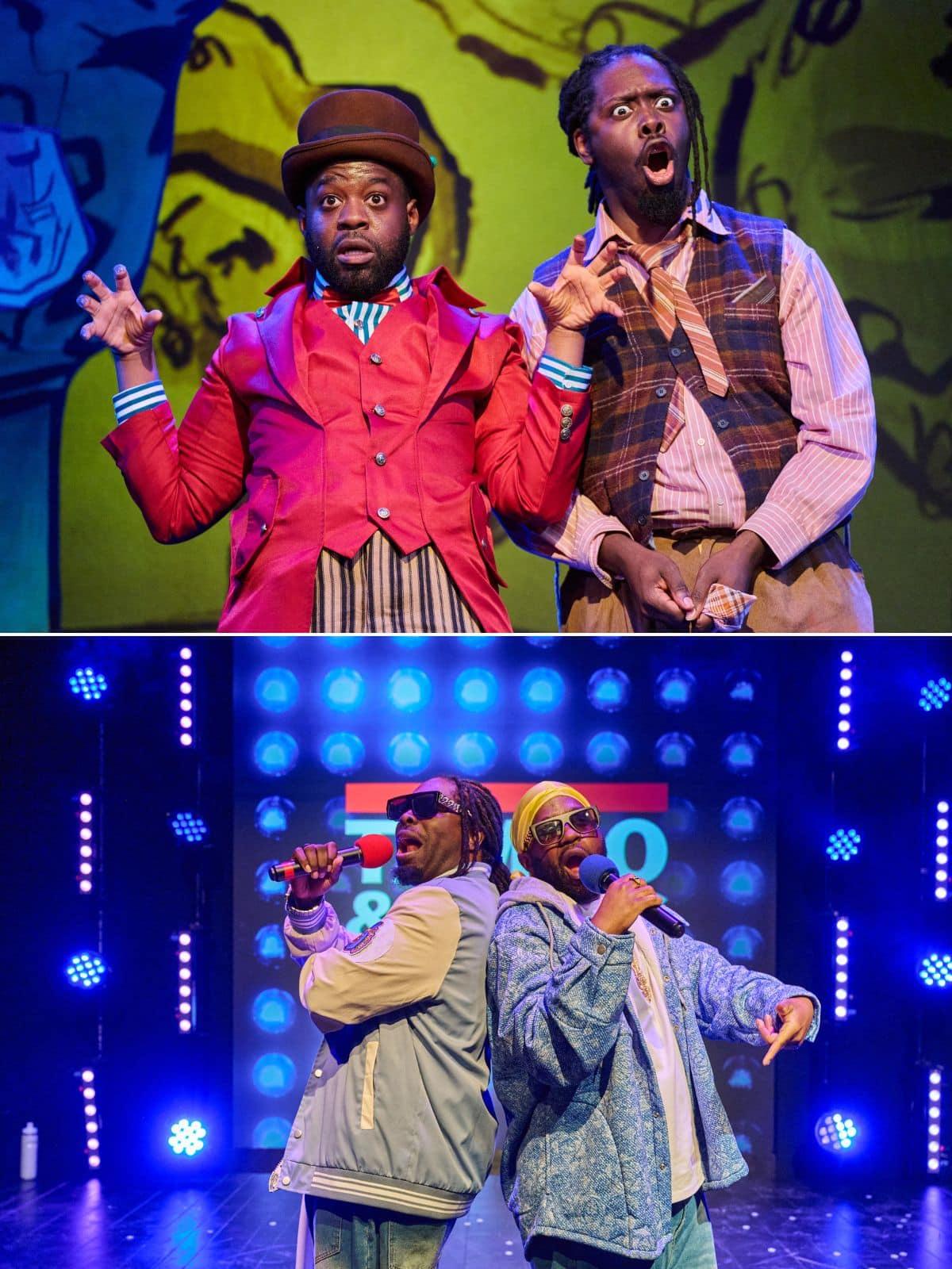 At a certain point in playwright Dave Harris’ Tambo & Bones, now making its DC debut at Spooky Action Theater, a record scratch moment occurs. Through a series of call-and-response rap numbers, performed by the show’s titular duo, we realize that we are no longer watching a play about Tambo and Bones. We are at a concert.