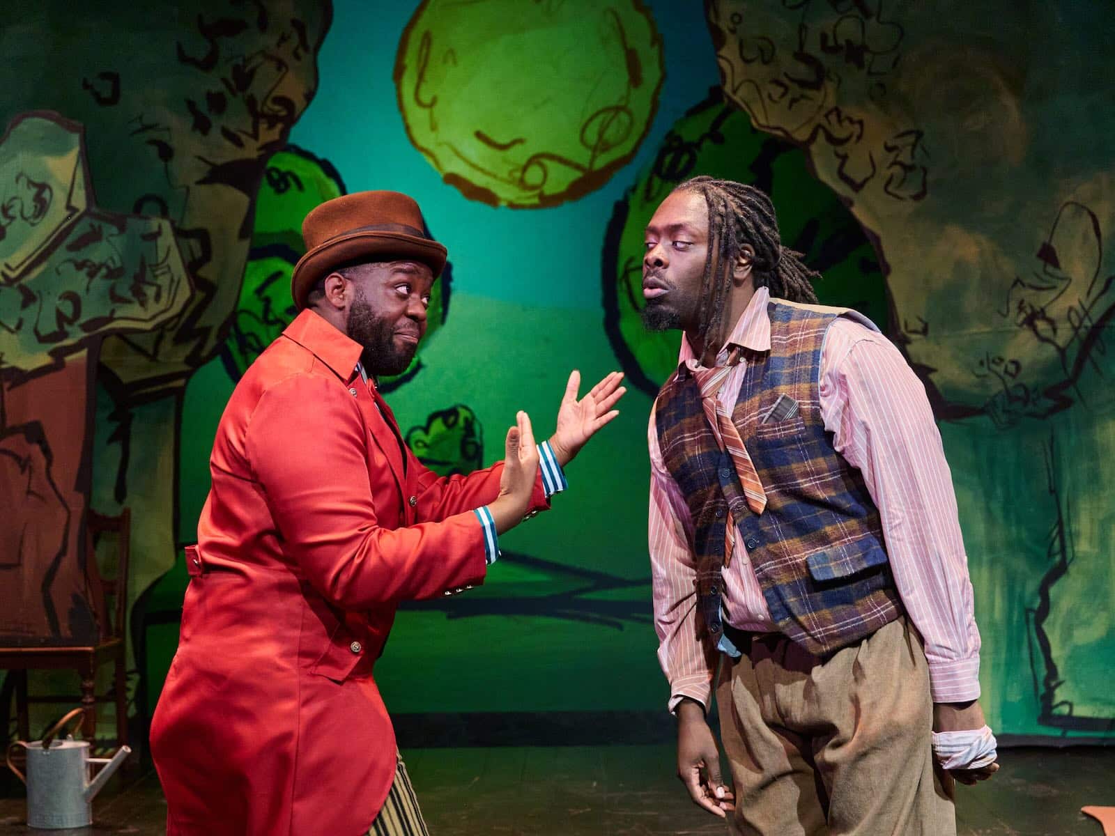 The play unfolds in three totally distinct acts (with an intermission between the second and third). In the first, Tambo and Bones appear as “clowns” in an exaggerated pastoral landscape that nods to Samuel Beckett’s Waiting for Godot. They wear brightly colored, loose-fitting suits (costumes by Rukiya Henry-Field) that nod to the early 20th century. The pair volleys ping-ponging, associative dialogue before slowly, horrifically, realizing they’ve been written into a minstrel show by an unseen playwright. But they don’t want to perform, especially not for an audience of white people with deep pockets. Tambo — woken from slumber and forced into introspection — longs to rest, and Bones is just trying to make a quick buck. They have no time for this writer’s nonsense.