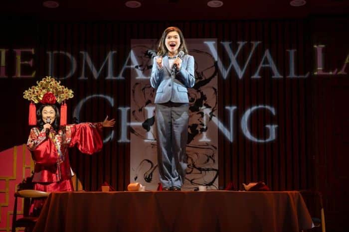 A top-notch artistic design gives a pitch-perfect tone to the locales, the characters, and their states of mind. The rotating set (by Wilson Chin), on a turntable stage, easily transitions from the well-appointed Chinese restaurant to the Friedman Wallace office and into the psychological distress of Ellen’s zany dream, all enhanced with projections (by Hana Kim), lighting (by Jeanette Oi-Suk Yew), and original music and sound (by Fabian Obispo) that accentuate their moods and transport us into their situations. And costumes (by Anita Yavich) range from the women’s power suits and high heels to the more youthful denim and tee-shirt of the off-work Katie and the dazzling traditional Chinese outfit in which Lee appears in Ellen’s mind, with well-matched hair and wigs (by Tom Watson), that define the figures and their quest for being seen, heard, and accepted in the world and the profession they’ve pursued.