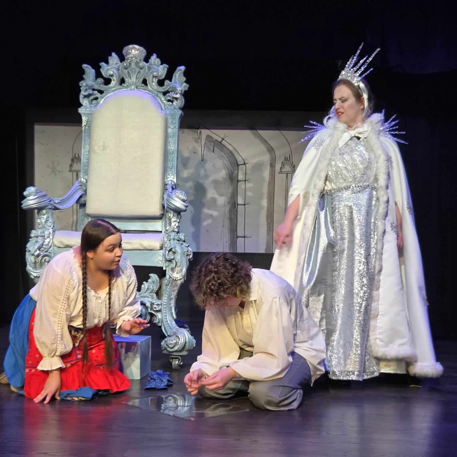 This may be in part because the commissioning company wanted the work to stick as closely as possible to the original words of Hans Christian Anderson. Andruski chose The Snow Queen, a lovely story with a happy ending about friendship, helpfulness, and perseverance, perfect for children. At the beginning of the show, the producer, Cassandra Redding, comes downstage to explain to the youngest members of the audience how things work in a live play — how they can cheer, and boo, and interact with the performers. (Instructing them how to do a standing ovation might have been a tad self-serving, but if the children are that excited, why not?)