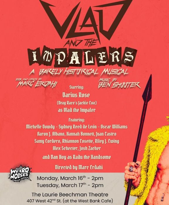 During the current 2025-26 season, the theme of the vampire has experienced a revival on both the stage and screen, with the multi-nominated award-winning horror film Sinners, written and directed by Ryan Coogler, the Off-Broadway musical Blood/Love: A Vampire Pop Opera, created by and starring Carey Renee Sharpe, and now playing a limited engagement at Theater 555 through May 10, and The Lost Boys, a new musical by David Hornsby (book) and The Rescues (music and lyrics), based on the 1987 Warner Bros. film, with previews beginning at Broadway’s Palace Theatre on March 27, and an opening scheduled for April 26. And there were also staged script-in-hand concert readings of two new works-in-development this month at the Laurie Beechman Theatre in NYC’s West Bank Café: a one-night-only performance of Black Watch Theatre Company’s “monster musical comedy” The Trouble with Dead Boyfriends by Annie Pulsipher (book and lyrics) and Alex Petti (music, lyrics, and orchestrations), directed by Rachel Klein (presently in London as director and choreographer of the “queer 80s horror comedy rock musical” I Was a Teenage She-Devil, with book, music, and lyrics by Sean Matthew Whiteford, playing at The Other Palace in April); and two industry presentations of Weird Noises Media Group’s “barely historical musical” Vlad and The Impalers by Marc Erdahi (book, lyrics, and direction) and Ben Shooter (music).