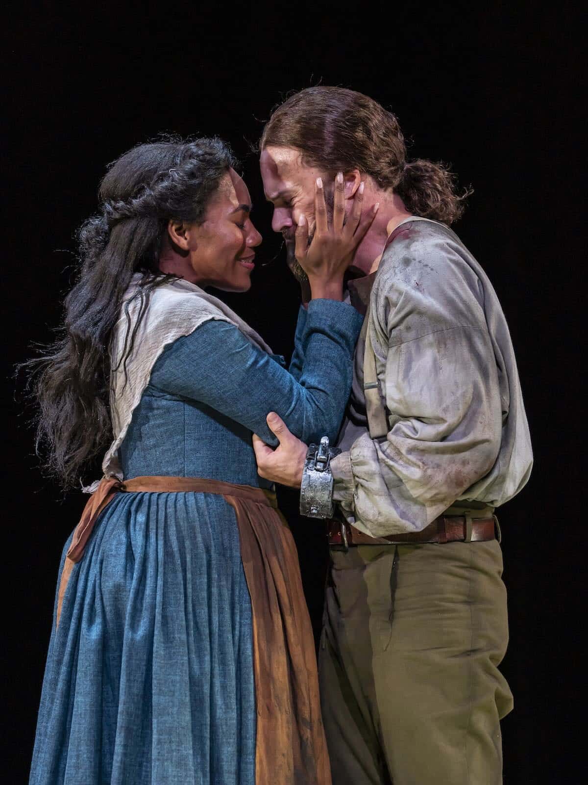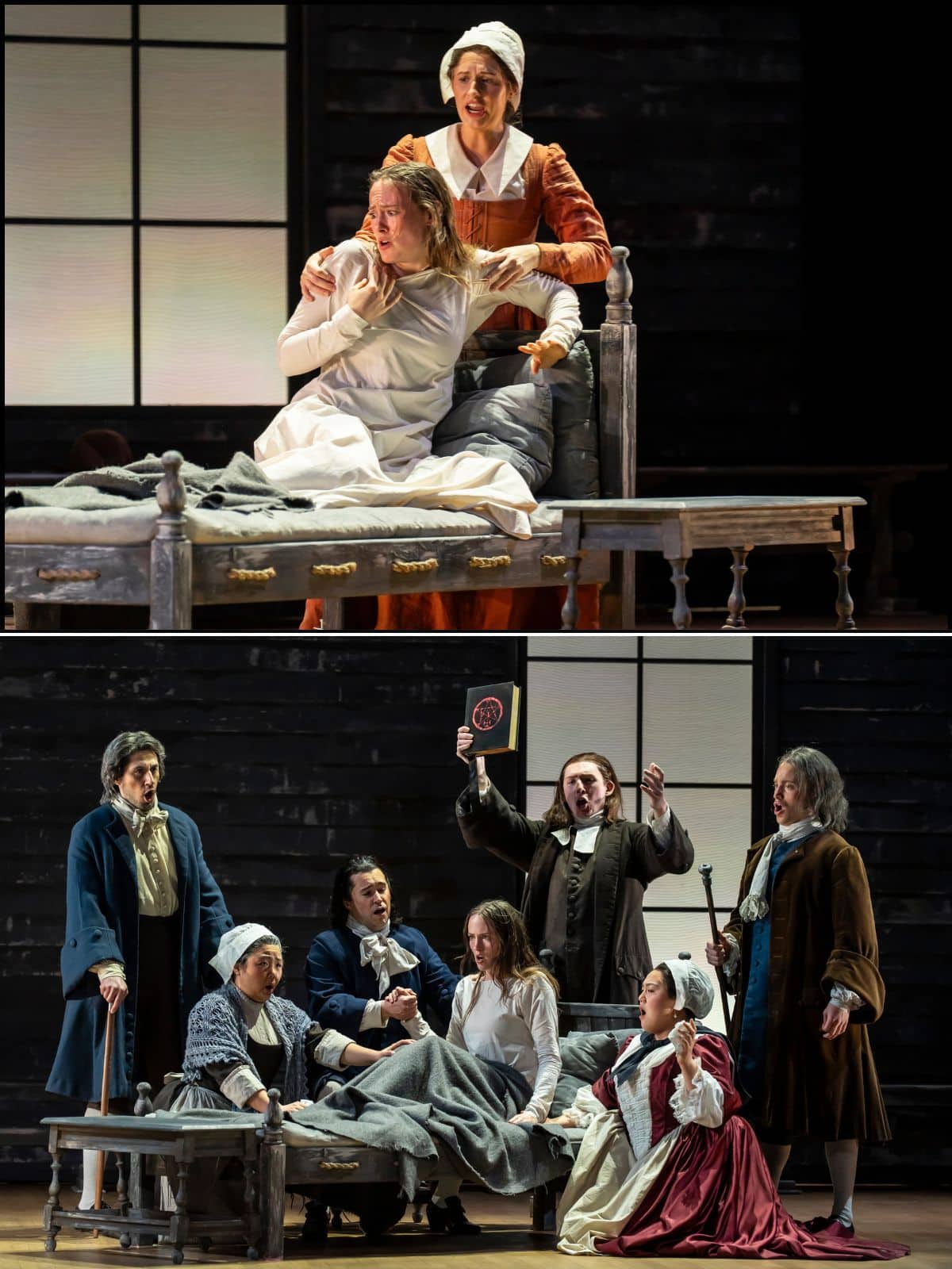 There is much beautiful music throughout, ably conducted by Robert Spano. He brings out Ward’s character motifs and jazz influences in both the orchestra and the singers. Particularly stirring is Ronnita Miller as the enslaved islander Tituba, singing of her longing to fly and escape the cold and cruel world to which she has been consigned. At one point, her mezzo deepens to contralto and solo becomes a trio with lovely vocalises from Michelle Mariposa and Tiffany Choe, who play two village women trapped on opposing sides of the conflict. Choe plays Ann Putnam, who gets involved in fanning the gossip and lies. Mariposa plays Rebecca Nurse, one of the 20 people executed in the Salem witch trials. She would not accuse others; she and John Proctor would not name names. Their strength of character and heroism cost them their lives.
