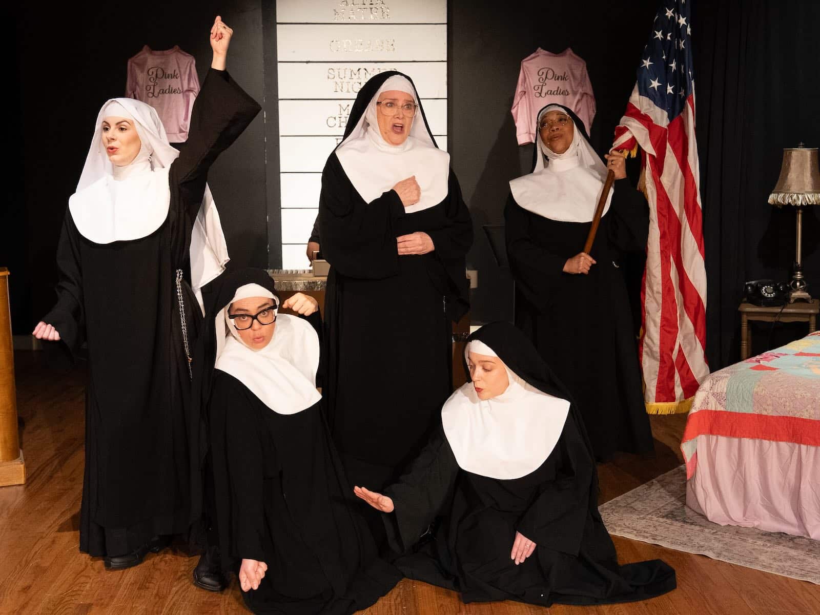 The meta nature of the show was furthered by the set design from director Jean Tegtmeyer (who also served as props master) and her creative team. At the beginning of the show, Kemp, as Reverend Mother, informs us that the local middle school (in the world of the show, of course) is also using the space for its youth production of Grease. She tells us that she simply doesn’t have the heart to destroy their hard work, therefore, our set includes a 1950s style diner to the left, a girl’s bedroom complete with a teddy bear to the right, and in the middle, a wall of vinyl records, Pink Ladies/T-Bird jackets, and a single keyboard that the priest uses to accompany the sisters’ songs.