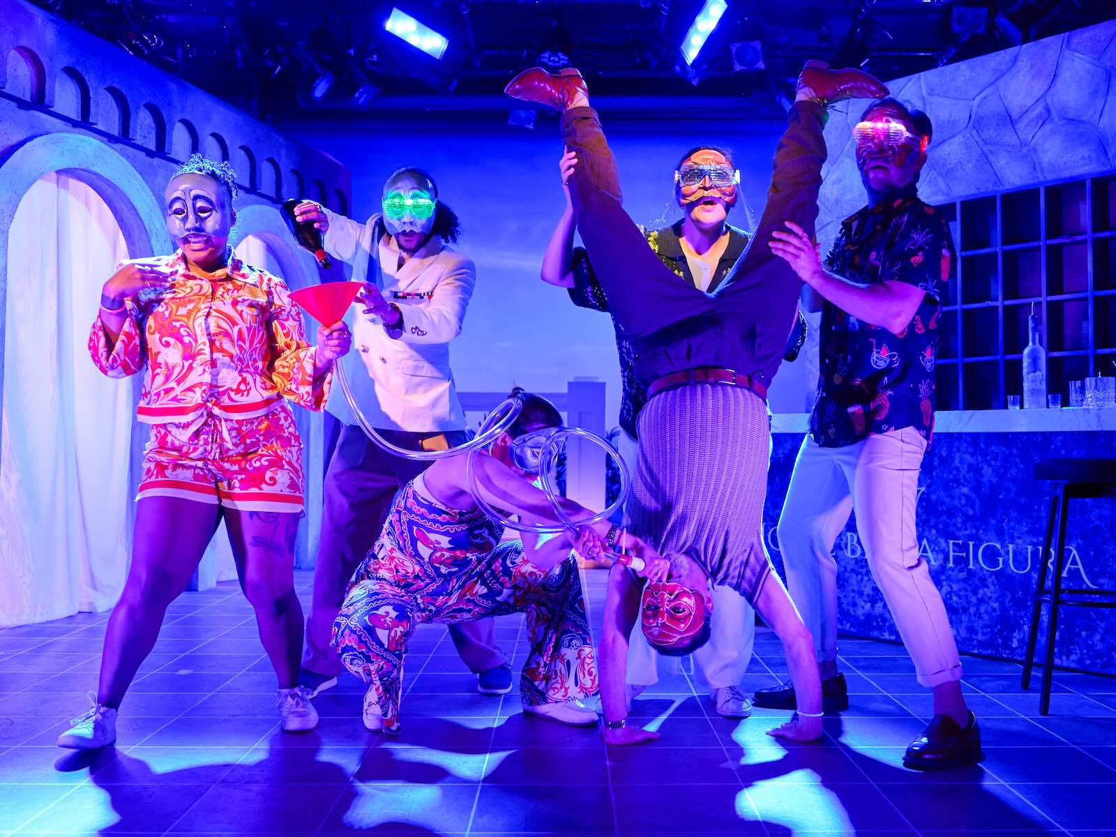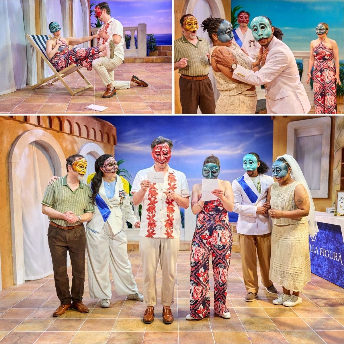 Lighting by William K. D’Eugenio is strikingly colorful and varied. During one of the dances, the cast, with strings of lights on their caps, hand tiny lights back and forth. In another, one cast member does a headstand. The commedia masks are by Tara Cariaso of Waxing Moon Masks. The props — all befitting the Riviera vibe — are by Katherine Offutt Ross.