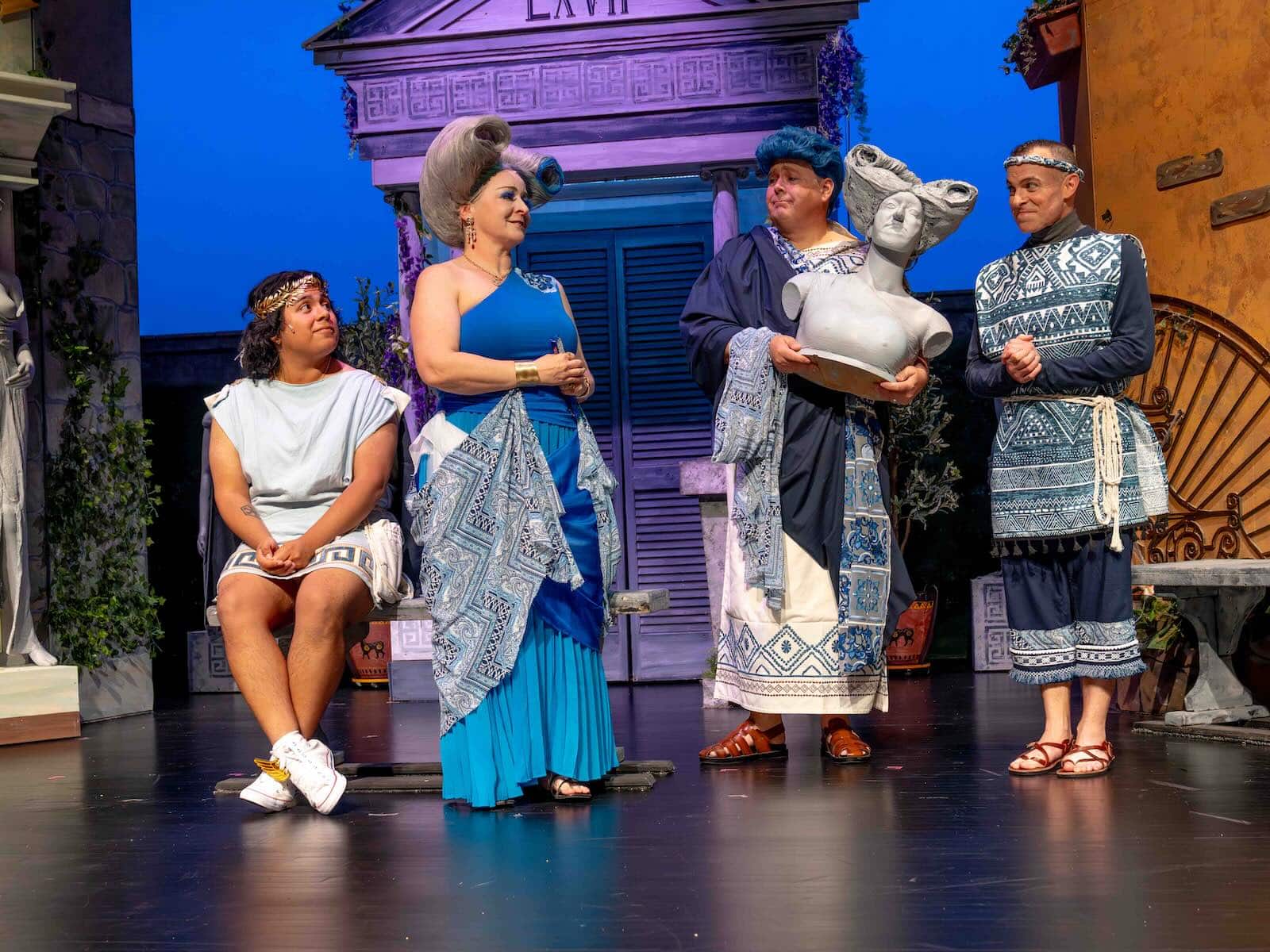 Of course, you can’t have a comedy centering around three houses without, well, the houses. Set designers Sheila Widerski and Dan Widerski (who doubles as the master carpenter) have constructed three detailed and distinct Roman-style houses, with support from set decoration designers Cathy Gurson and Liz Mykietyn. Erronius’s window box of marigolds with a working fountain is a lovely touch. A rude statue in front of the House of Lycus is an especially noteworthy piece of stage business. And a special mention goes to the creation of “Domina’s bust,” created by a team of five people (Cathy Gurson, Liz Mykietyn, Dan Widerski, Charlene Sloan, Stacy Ferreira) and stealing the show in its own right.