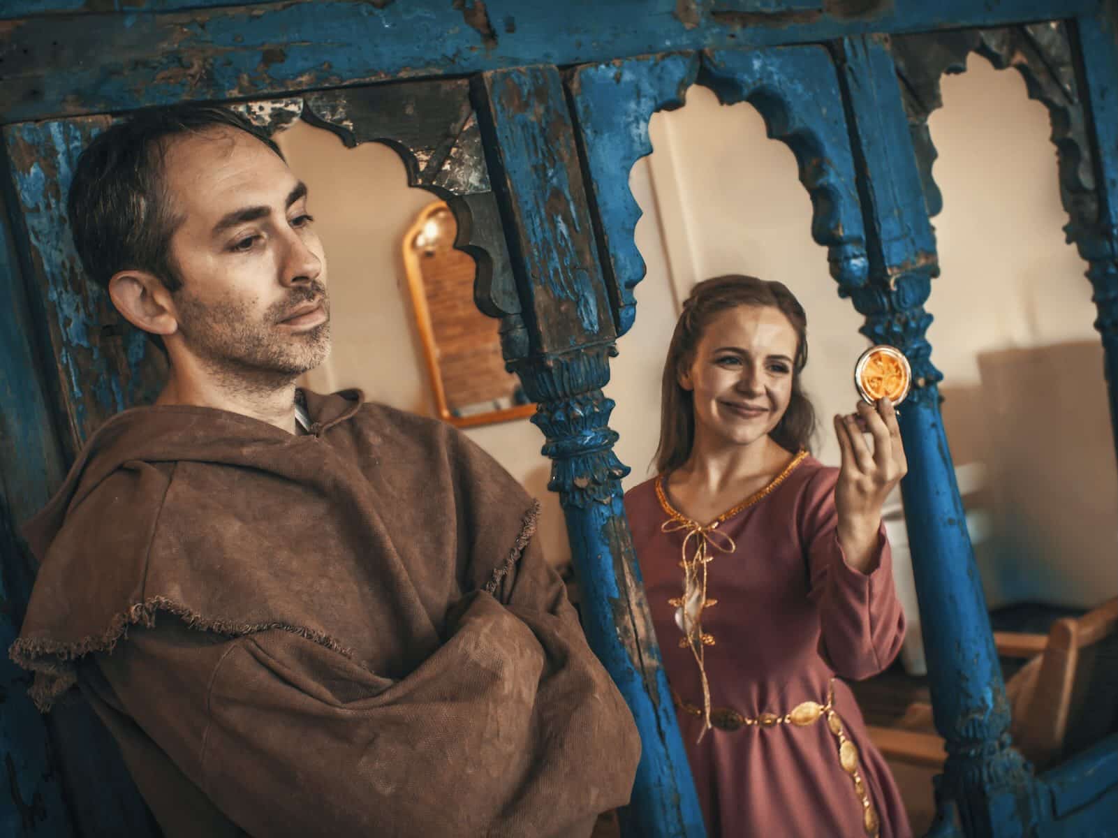 Costume designer Christina R. McAlpine crafted ornate medieval outfits and headpieces, complete with vibrant jewel tones and shimmering gold accents. She presents the poor in simpler, worn fabrics, creating a clear distinction between social classes. Carrie Shade’s prop design incorporates period visuals, including embroidered medieval tapestries and intricate bird cages. Lighting designer Wes Bedsworth uses darker lighting for scenes involving the poor, and brighter illumination for the scenes depicting the wealthy. This distinction seamlessly transports the audience between the two worlds, defining the environment of each moment.