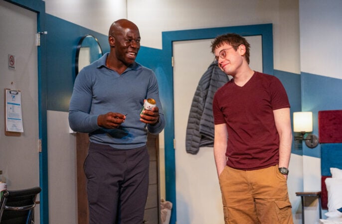The two-hander, directed with growing tension by Shira Milikowsky, moves back and forth between present real time and flashbacks to the recent past, to uncover the nagging thoughts, ambiguous relationships, and incidents from which the profoundly distressed characters seek escape. As the beers flow, Teddy, a professional in the world of finance, and Jeremy, on route home from a year of volunteer work at a medical clinic in Uganda, initially joke with each other about the likelihood of bugs in the bedcovers, engage in an awkward on-again-off-again will-they-or-won’t-they dalliance (the unsure Jeremy’s first with a man), then begin to open up to each other about themselves and the problems that brought them there, as the night builds to an intense climax.