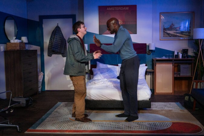 There’s a lot going on in a double room at a cheap hotel near Amsterdam’s Schiphol Airport, where two American strangers end up together for what might have been a casual one-night stand after meeting in the hotel bar. But Teddy and Jeremy, in search of a few hours of distraction and solace, are dealing with the devastating psychological and emotional impact of haunting secrets, trauma and guilt, friendship and love, sexual identity and homophobia, compassion and forgiveness in Ken Urban’s explosive 2017 drama A Guide for the Homesick, originally commissioned by Epic Theatre Ensemble and now playing a limited engagement at NYC’s DR2 Theatre.