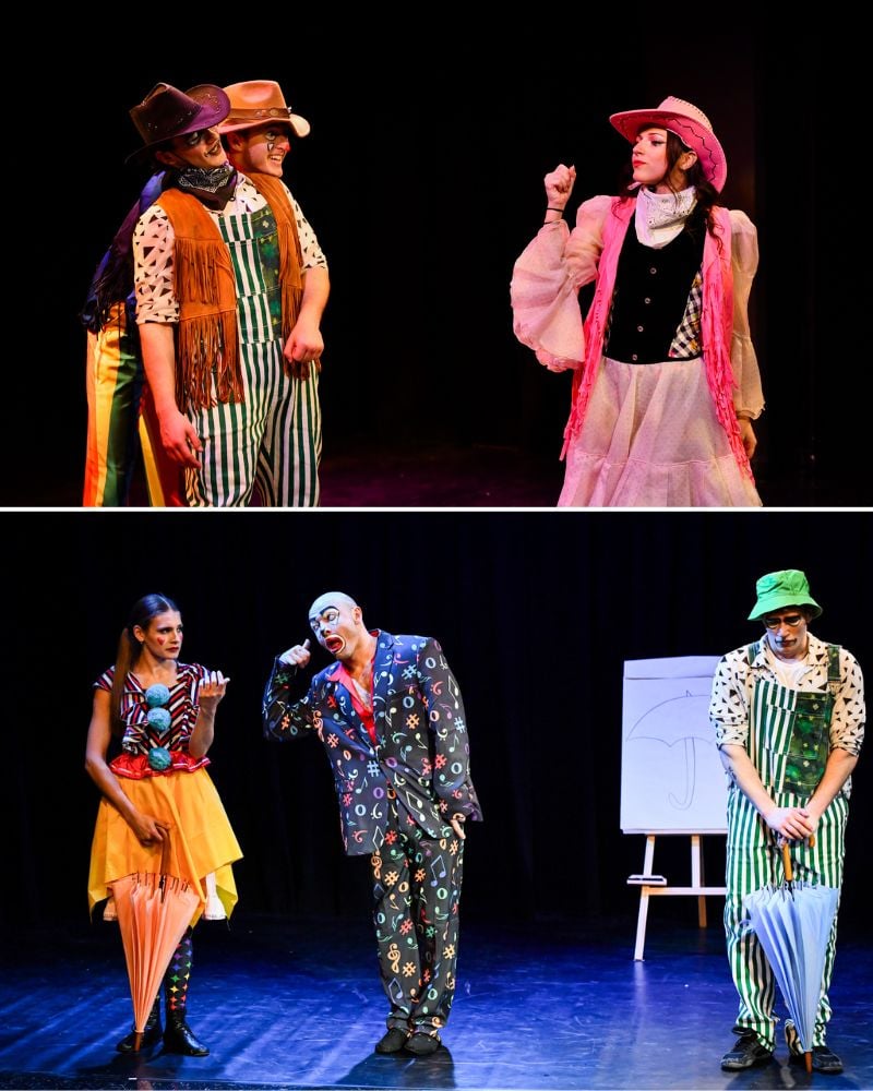 Before the start, we hear a series of Christmas carols, from “White Christmas” to “Let It Snow.” Next, Tasiko, in pigtails and a multicolored costume, brings out a whiteboard and draws a picture. The audience is offered the chance to guess what it is. (The children especially enjoy this.) There are six sketches: The Mask, Baby in the Park, The Umbrellas, Cowboys, The Wall, and Butterfly. Here are some of the highlights — not complete vignettes but snippets of scenes.
