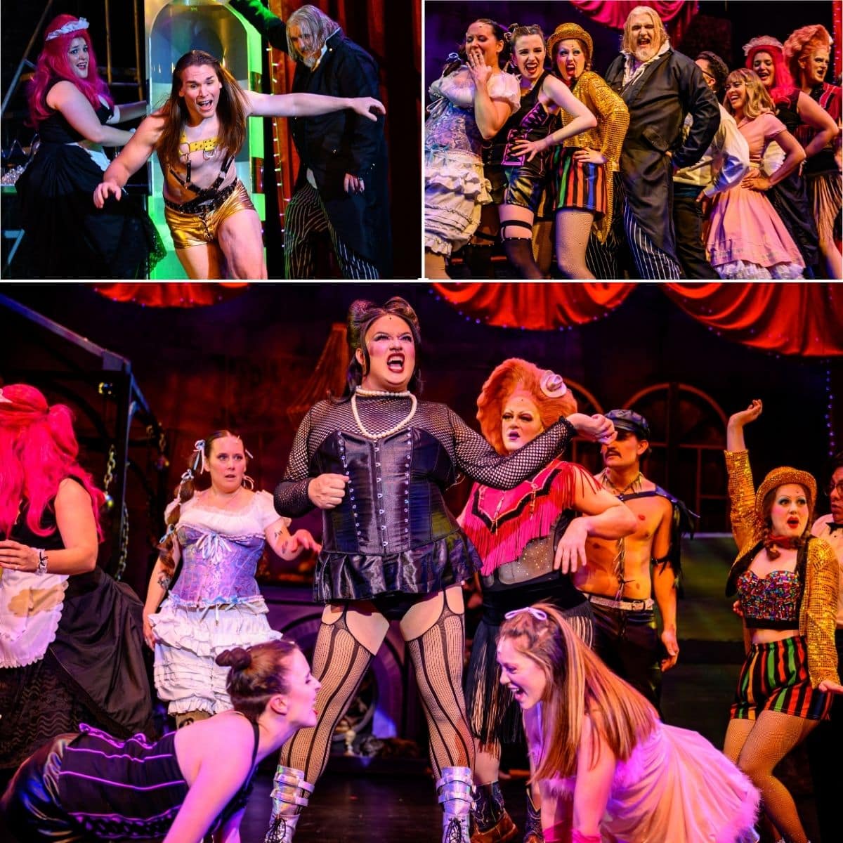 With all the henchmen and phantoms in place, as well as the innocent bystanders, how about the host and mad scientist with the unbridled libido and cruel streak, Dr. Frank? Making his entrance striding down the center aisle like the entire theater was his to own, Eric Morris commands the stage from his first withering look to his glorious death scene in the “final reel.” Nearly everyone knows how Tim Curry became a legend playing Frank in the 1975 motion picture. Not to take anything away from Curry, but Morris makes the role his — and her — own, owning the black corset, fishnets, and fabulously styled black wig. Switching from a purr to a snarl, from wounded bird to vicious villain, Dr. Frank fits Morris like a glove. His take on Frank’s signature song “Sweet Transvestite” is a highlight, and he makes it his own.