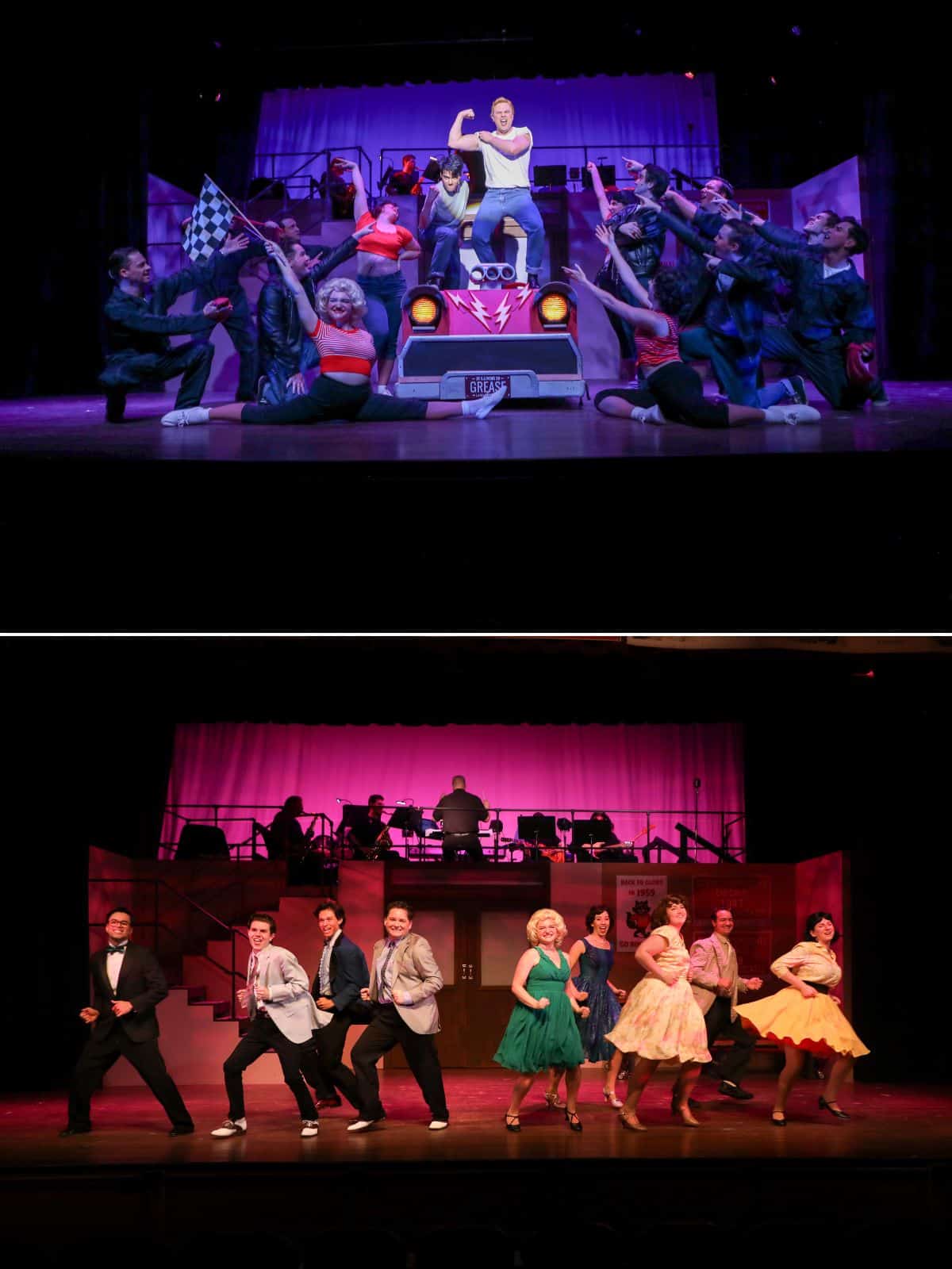 Leading the cast of greasers and bobby-soxers are Shannon Hardy and Jake C. Schwartz as Sandy and Danny, respectively. Hardy, complete with blonde ponytail, is the essence of the sweet, fish-out-of-water, sheltered school girl, fresh from Catholic school, now fending for herself in a rough and tumble public school. With thick, wavy hair and the requisite leather jacket, Schwartz strides through his scenes with an easy, swaggering charm; Danny might be a bad boy to his pals, but he’s mostly a pussy cat around Sandy. Hardy and Schwartz also have the vocal chops to handle their big numbers, starting with “Summer Nights,” recounting their vacation rendezvous, joined by their classmates eager for the juicy details. They also impress with their penultimate number together, “All Choked Up” (the original song replaced with “You’re the One That I Want” for the movie).