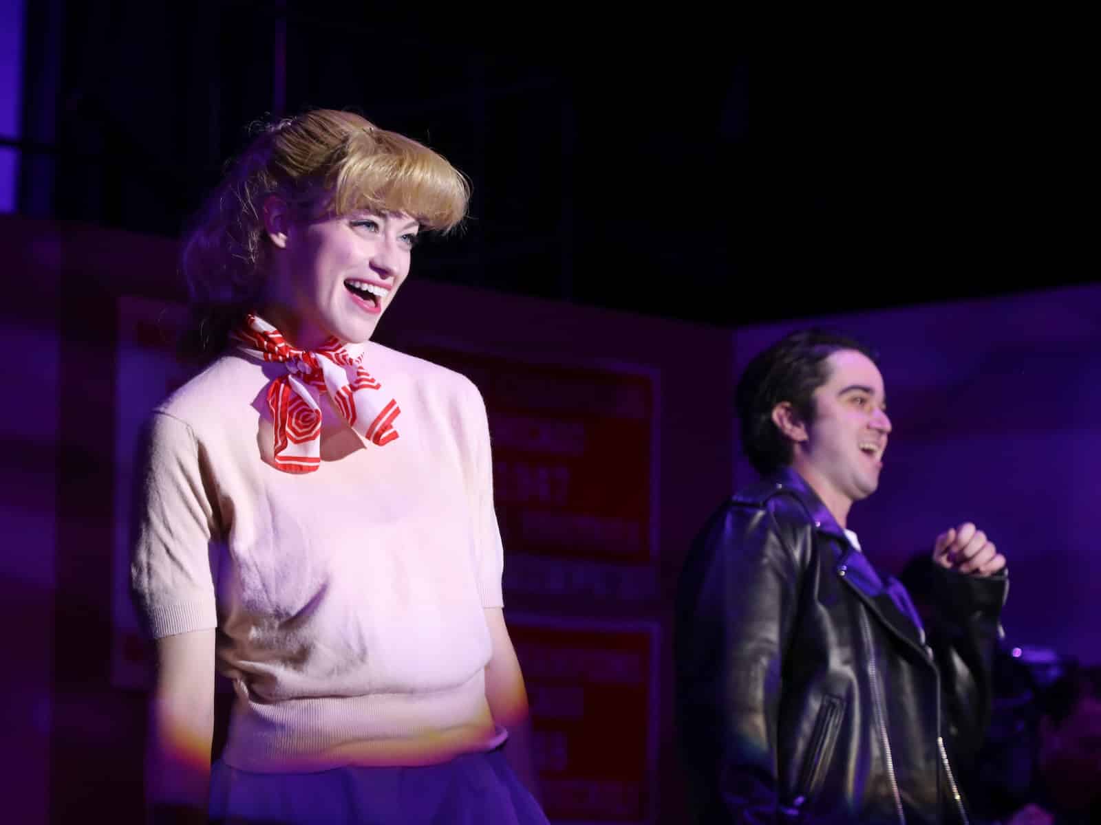 Stepping out of the lively ensemble, Brady Misustin is the boy singer Johnny Casino (“Born to Hand-Jive”), Garret Rinker warbles winningly as Frenchie’s teen guardian angel, with the song “Beauty School Dropout,” and as a radio singer, Marissa Michaels duets with Hardy’s Sandy for the sweet and sad “It’s Raining on Prom Night.”